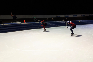 Tenslotte volgde het spektakelstuk van de avond: een ploegenachtervolging over drie ronden met vier teams, samengesteld uit alle senioren en de oudere jeugd. De eerste twee ronden moesten de teams bij elkaar blijven, waarbij ze elkaar mochten duwen (net als op tv!). De laatste ronde mochten de twee snelsten van het team afsprinten, waarbij de tijd van de tweede schaatser telde als eindtijd. Door een goede verdeling van niveaus werd het een leuke en spannende wedstrijd.