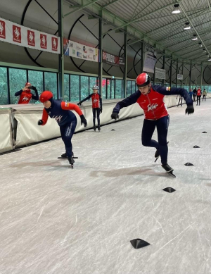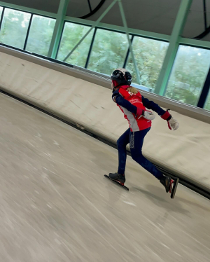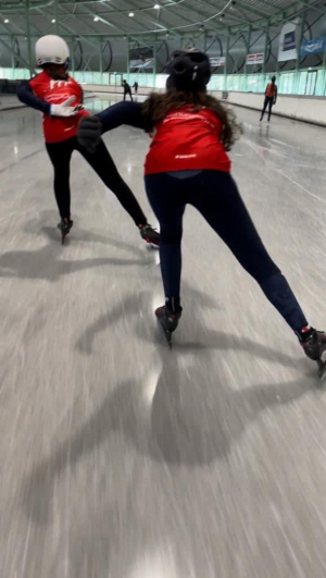 Eenmaal aangekomen moesten we nog even op de andere busjes wachten. Toen we compleet waren begonnen we met een warming-up. Daarna kregen we allemaal een heel leuk cadeautje van de moeder van Cas. Daarna trok iedereen zijn schaatsen aan en vertrokken de schaatsbaan op. Iedereen heeft de eerste dag hard getraind en kregen we een korte pauze met warme chocomelk en lekkere cupcakes van Elmi en Julie. Daarna gingen we nog even schaatsen totdat de baan dicht ging. Toen we de schaatsen weer uit hadden vertrokken we naar de locatie waar we overnachten. Eenmaal daar gingen we onze koffers uitpakken en de bedden opmaken en gingen we eten; macaroni met een kleine salade en als toetje yoghurt met ranja. Na het eten hebben we nog gespeeddatet. Iedereen leerde elkaar wat beter kennen. Het was een hele leuke eerste dag!