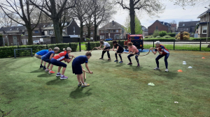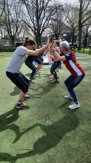 Met een klein groepje (7 personen) en Maria Mekes die de bootcamp verzorgde, zijn we lopend vertrokken naar de speelplaats. Op de speelplaats van kunstgras, was een circuitje opgebouwd met touw, kleine medicijnballen, elastieken en hoedjes.