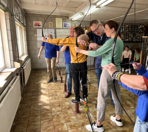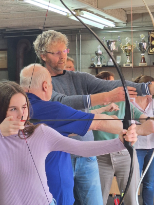 Enthousiaste leden van de handboogschutterij V.Z.O.D. (Vriendschap Zij Ons Doel) brachten zo’n 20 schaatsvrienden de kneepjes van het handboogschieten bij. Dat bleek nog niet zo gemakkelijk, er vloog nogal eens pijl langs het bord. Maar hebben we ook een heus handboogtalent: Marianne Waelpoel schoot haar eerste pijl midden in roos! Heel bijzonder was het dat we zelf binnen stonden en de pijlen door openstaande ramen naar de roos moesten schieten, die buiten stond. Een erg leuke activiteit! (Peter Bakker)