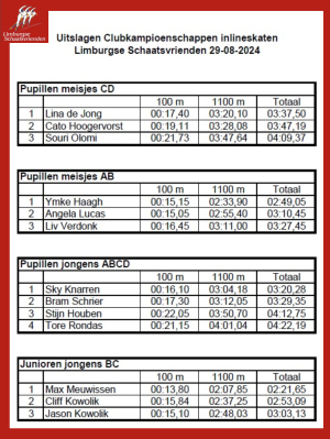 De medailles werden uitgereikt per categorie, waarbij sommige categorieën waren samengevoegd om de strijd spannender te maken. Elke deelnemer kreeg sowieso een oorkonde als herinnering aan deze Clubkampioenschappen inlineskaten.