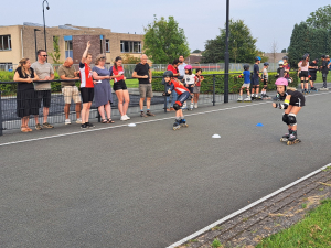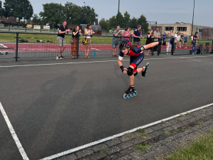 Het zonnetje was ook van de partij en daarmee konden de weersomstandigheden eigenlijk niet beter. De deelnemers deden ook hun uiterste best, want 2 volle ronden zo snel mogelijk rijden dat is een behoorlijke uitdaging! Zeker voor degenen die nog niet eerder een wedstrijdje hadden geskeelerd en/of geschaatst. Het plezier was duidelijk te zien en met aanmoedigingen van ouders en ander publiek was het een gezellige avond.