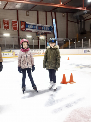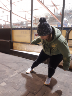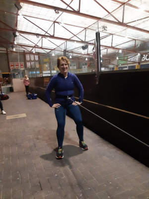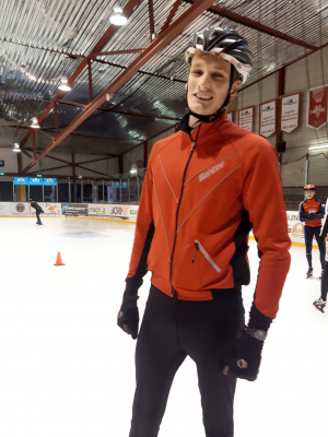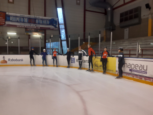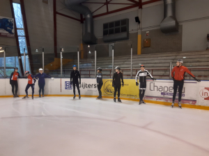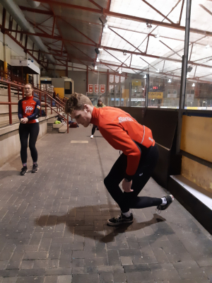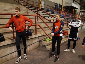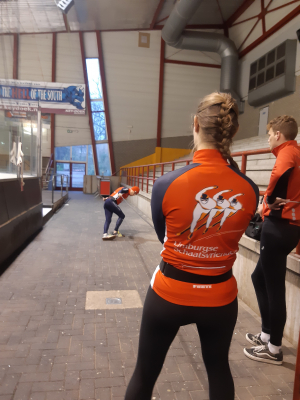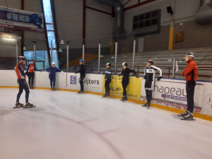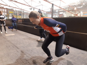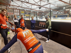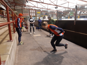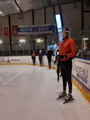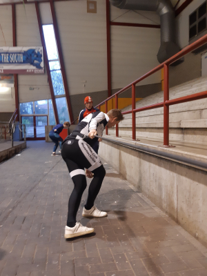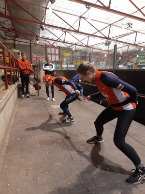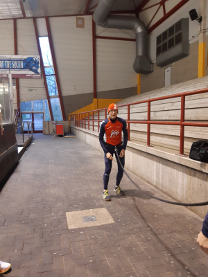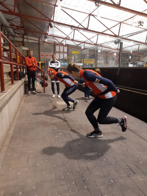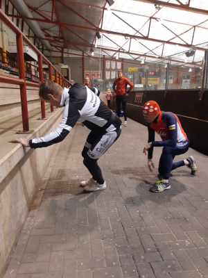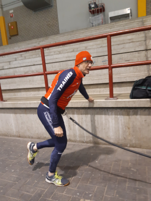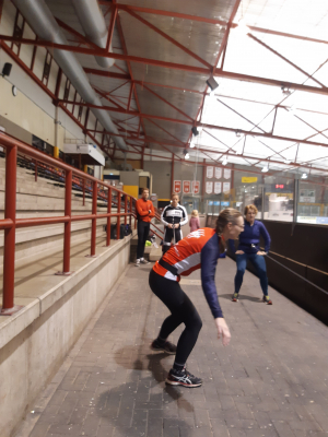 Voor een goede schaatstraining heb je niet per se ijs nodig. Op zaterdagochtend zijn we begonnen met zo'n 20 minuutjes droogtraining voordat we het ijs op gaan. Met trainingselastieken oefenen we bijv. de zijwaartse afzet en de start. Hoe strakker het elastiek, hoe meer je kan hangen en hoe meer kracht je moet leveren. Spierpijn gegarandeerd!