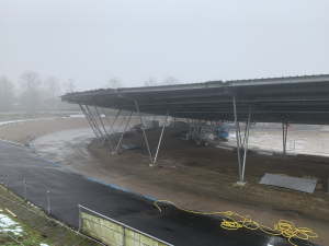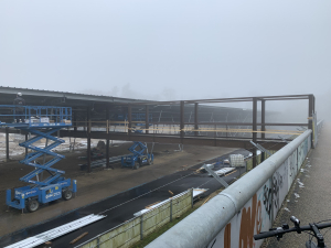 De belangrijkste reden is een zogeheten bouwweg. Daarover worden alle materialen aangevoerd, maar deze moet tijdelijk weg om de leidingen van de koelmachine naar de 400-mbaan aan te leggen. Deze weg is ook nodig voor het aanvoeren van materialen voor de bouw van de overkapping. Het heeft alles te maken met keuzes in de planning voor de totale bouw. “Omdat ook het sporten door moet gaan, is het altijd een complex geheel”, aldus de bouwcoördinator.